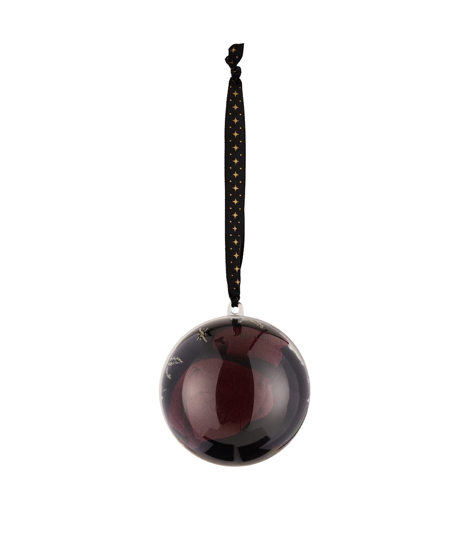 Take home this festive bauble filled with a pair of bespoke Hogwarts House socks. The soft cotton socks feature a design of each of the Hogwarts House historical symbols in traditional colours; a lion for Gryffindor, a snake for Slytherin, a badger for Hufflepuff and an eagle for Ravenclaw. The design is made up with silver and gold stars distributed across a black background. The bauble is complete with a red ribbon, perfect for hanging up some festive spirit this Christmas.
