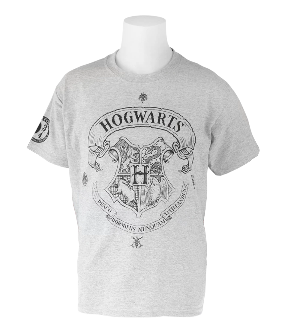 On the front chest, a classic Hogwarts crest can be seen in illustrative black line work. A scroll announcing ‘Hogwarts’ along the top can be seen in bold black font, with the school motto written on a smaller additional scroll underneath. The light grey t-shirt is complete with a small Platform 9 3/4 emblem printed on the left sleeve.