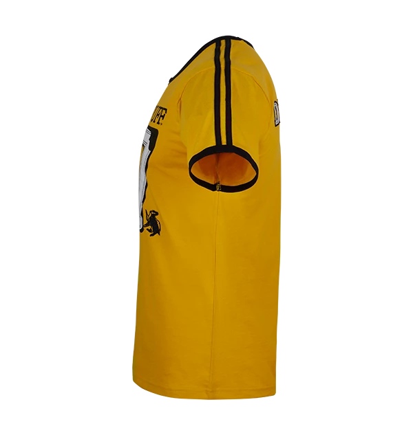 A comfy adult athletic T-shirt in striking Hufflepuff yellow with white and black applique of number 07 on front and the name “Diggory” on the back. Features “Hufflepuff” in black screen print and black embroidered house icon on front. Double-stitched black fabric stripes down the sleeve, and edging around hem of neck and sleeve, give a finished look. Embroidered, screen-printed and appliqued features.
