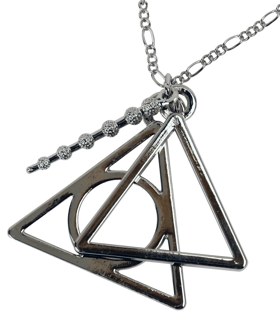 This triple-layered Deathly Hallows necklace encompasses all three symbols of the Deathly Hallows; the resurrection stone, the cloak of invisibility and a tiny replica of the Elder wand hanging in the centre. Each symbol is featured as a charm. Xenophilous Lovegood can be seen wearing a similar necklace in Harry Potter and the Deathly Hallows.