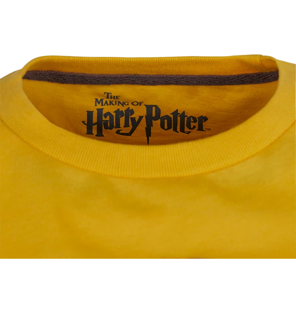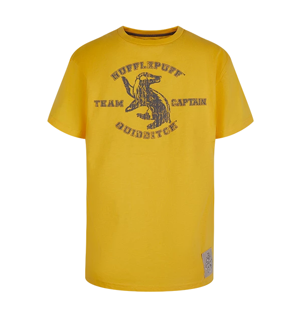 Join the Hufflepuff Quidditch team with this Kids Hufflepuff Quidditch Team Captain t-shirt. The t-shirt is a bright yellow colour, the traditional colour of the Hufflepuff house, and features a raised flock print design across the chest in grey of the Hufflepuff house animal, a badger.
