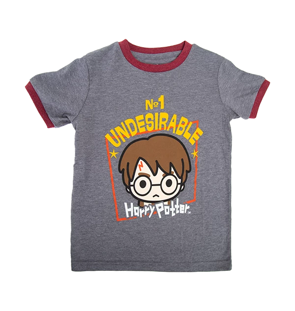 This adorable kids Harry Potter t-shirt features a cartoon version of the ‘Wanted’ poster for the young wizard, as seen in both Harry Potter and the Deathly Hallows films. The kawaii style artwork of Harry’s face can be seen framed by a quirky yellow font reading No. 1 Undesirable, and his name at the bottom. The grey t-shirt features red ringer cuffs and neck, while a graphic print of Harry’s glasses and lightning bolt are centred at the top back.